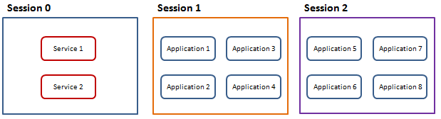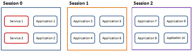 在windows 2008以及以后的系统中,微软改变了这种方式,Session 0中只包含了系统服务,其他应用则在不同Session 中运行。如下图:
